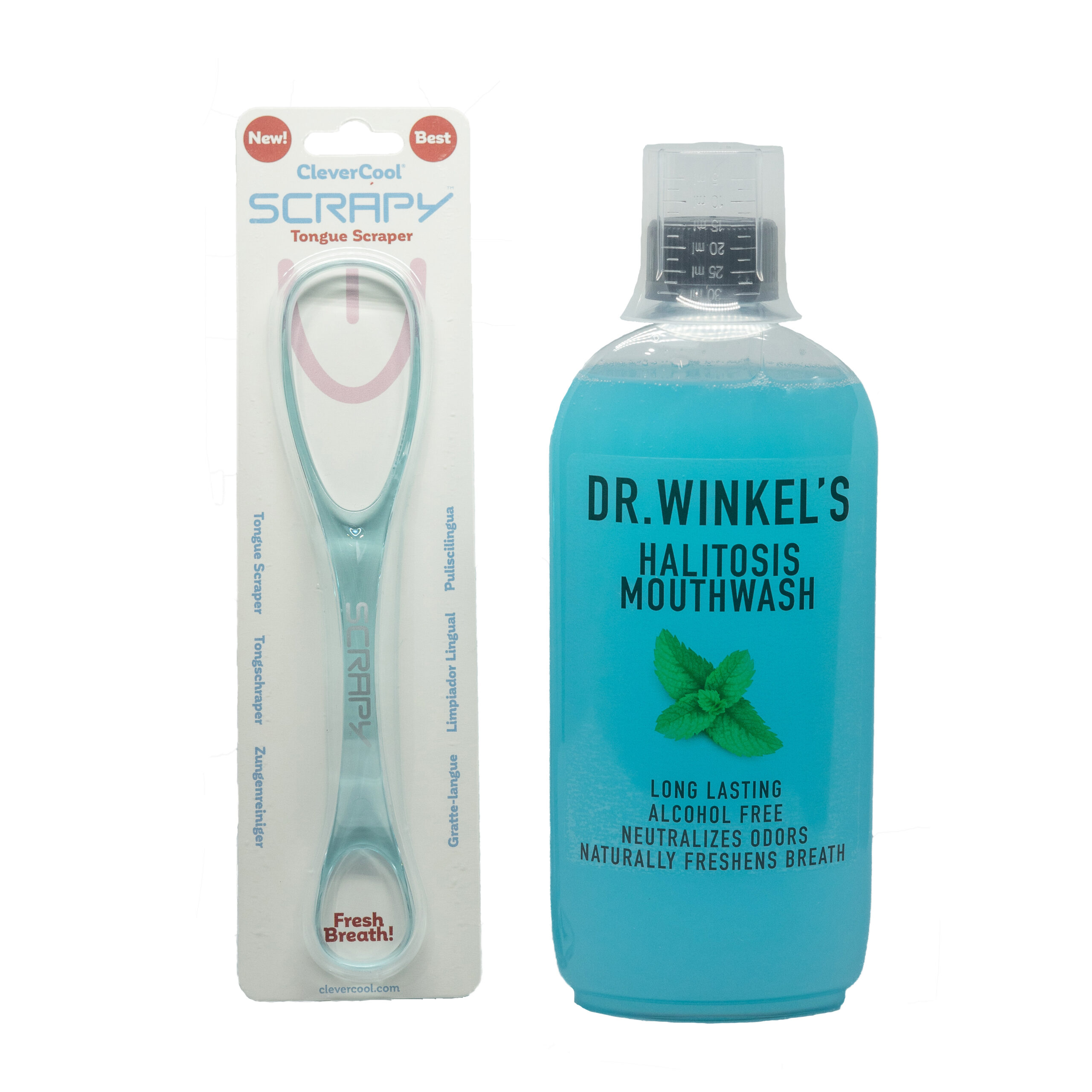 Tongschraper en Halitose mondspoelmiddel, ontwikkeld door Dr. E.G. Winkel, de halitose specialist.